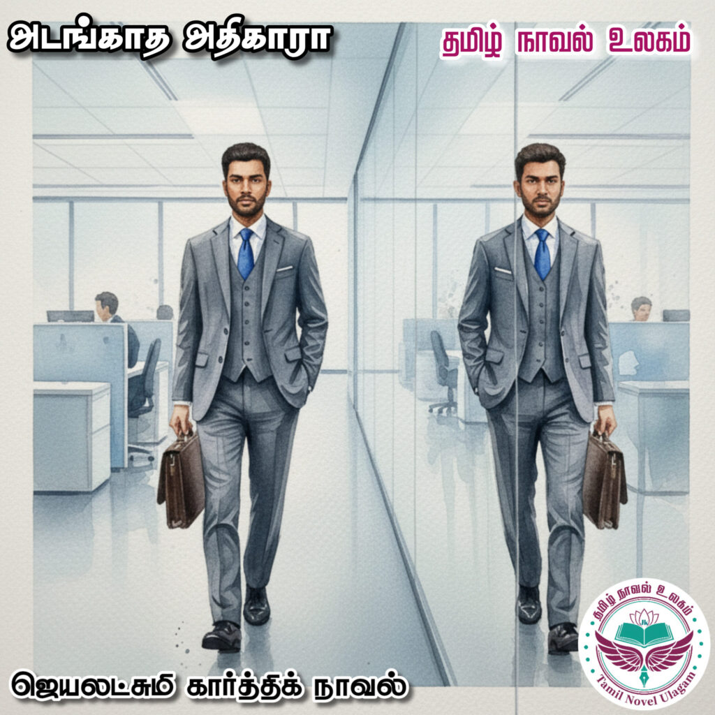 “என் செல்ல அம்மா.” என்று அவரை வழியனுப்பி விட்டு, காலையில் வழக்கமான உடற்பயிற்சி யோகா எல்லாம் முடித்து அன்னை கொடுத்த உடையை அணிந்து கொண்டு தன் அலுவலகத்திற்கு கிளம்பினான்.