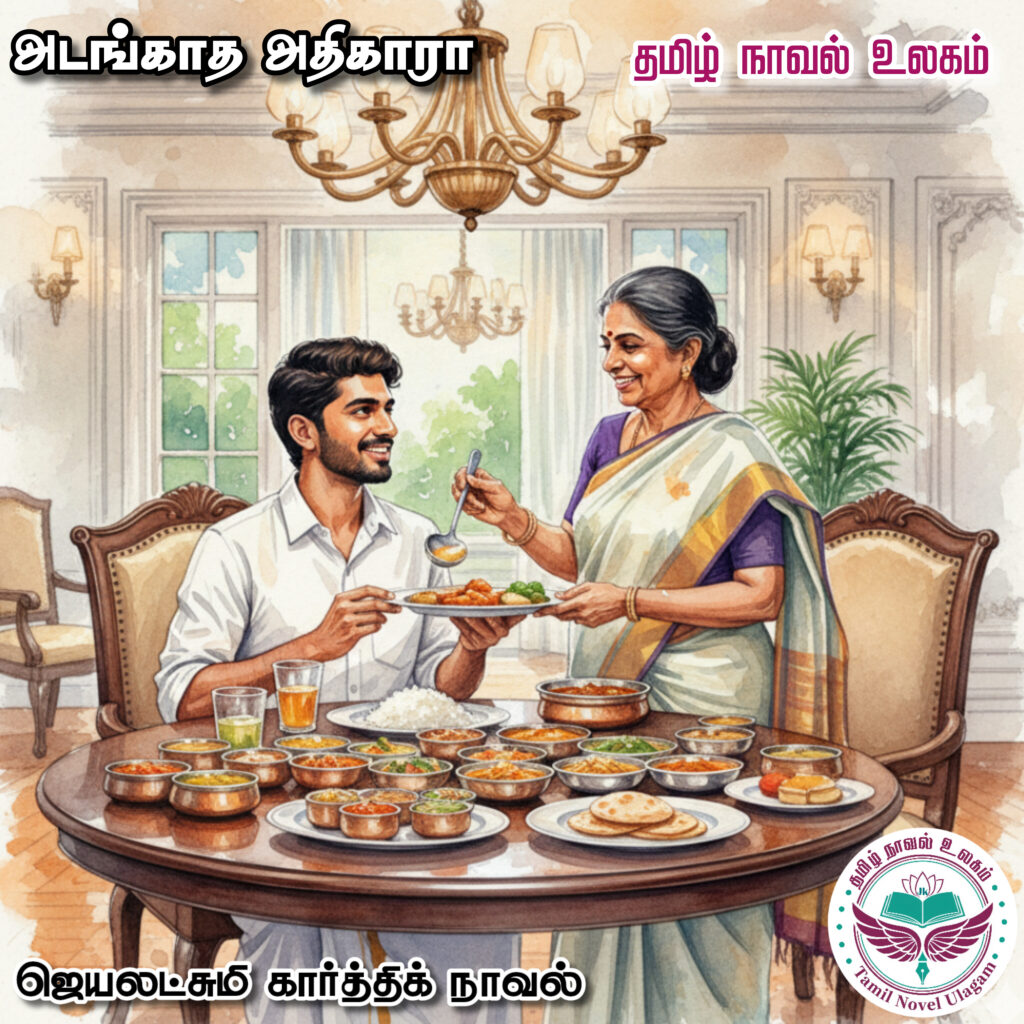 “கேலி பண்ணாத கண்ணு. வா அம்மா சாப்பாடு போடுறேன். சாப்பிட்டுட்டே நீ எனக்கு விஷயத்தை சொல்லு.” என்று உணவு மேசையில் அவனை அமர்த்தி உணவைப் பரிமாறத் துவங்கினார்.